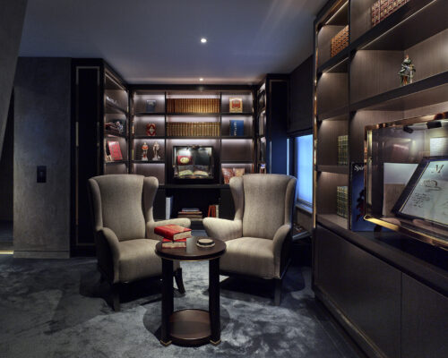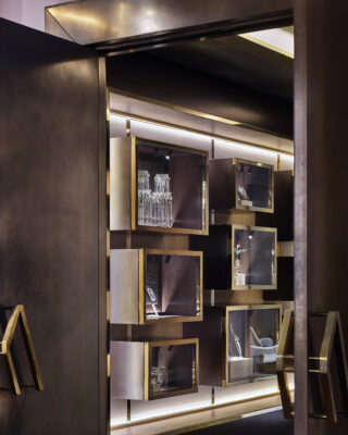 Marcus Townhouse’s brief was to create a truly unique ‘Alice in Wonderland’ space where showcasing a curation of unique timepieces and rare objets d’art. The journey through the listed building was reimagined calling upon MAWD’s superyacht and hospitality expertise and delivering a unique retail experience for lovers of luxury. MAWD’s design for Marcus is based on the unexpected, but maintains a sense of continuity between spaces. On reaching the first floor, you enter an elegant drawing room with spectacular views across the Square, thoughtfully restored with bespoke display cabinets as well as a secret cabinet containing some of the most unique watch and jewellery collections in the world. The ‘curator’s gallery’ is the epitome of the rarity, with aged metal portals in the feature some of Marcus’s favourite items.